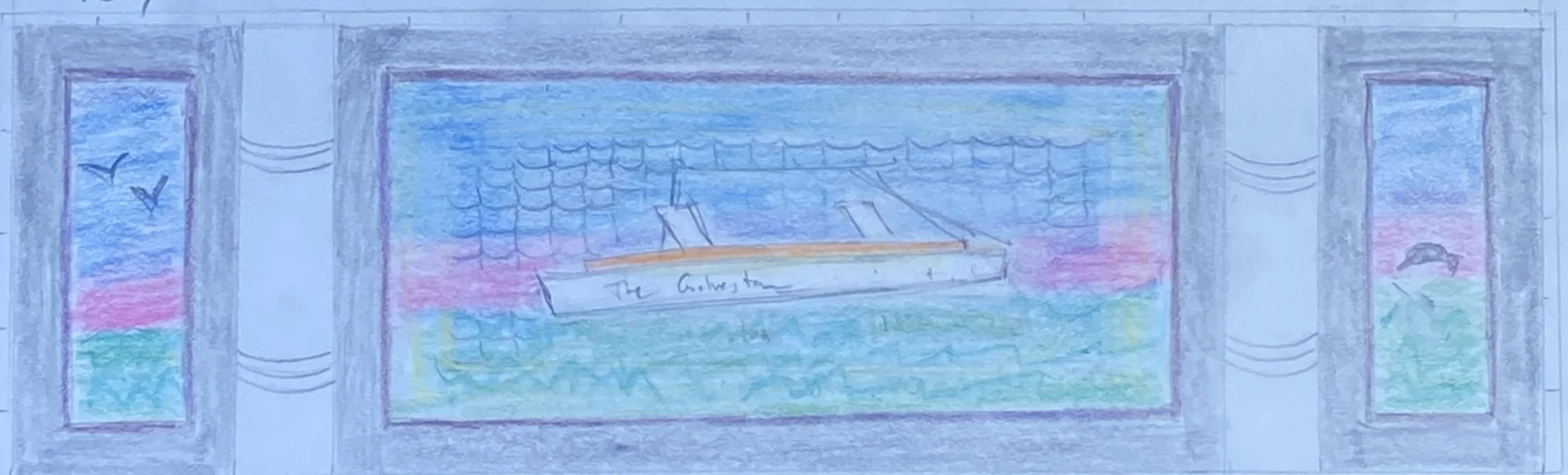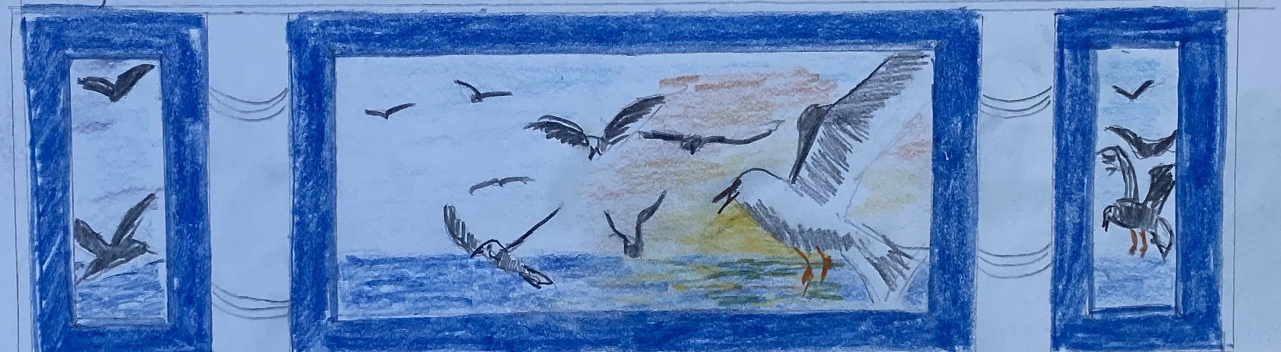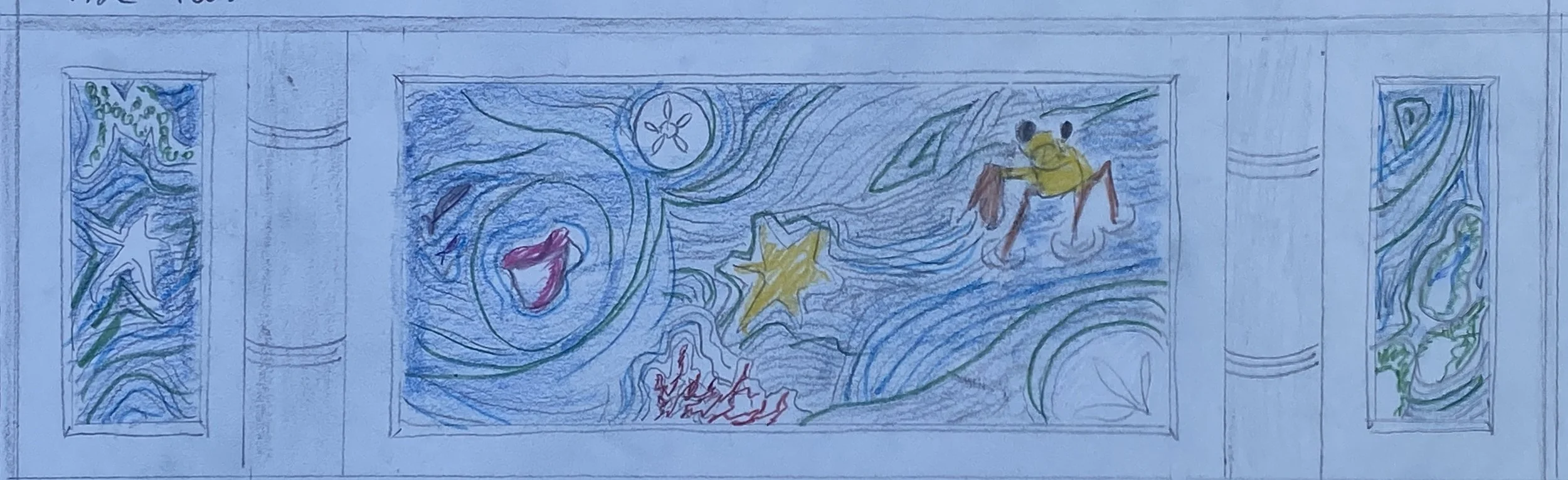 My apologies for the crummy drawing. The subject is shells and critters that you might find in a tide pool on the beach. I would fabricate this in stained glass, shell, stone, and handmade porcelain inclusions. I would make the mural more colorful than this vase, but the vase may give you a better idea of the tide pool concept.